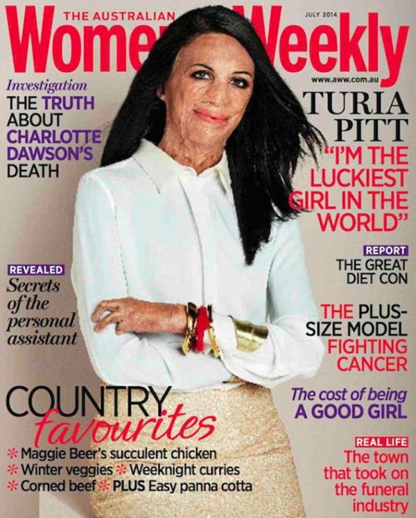 Таких «Дівчат з обкладинки» у австралійського жіночого глянцевого журналу Women'sWeekly (а може, і у всього світового глянцю) не було раніше ніколи. Для липневого номера продюсери організували фотосесію Турії Пітт - відомої в країні спортсменки, у якої 65 % шкіри уражено глибокими опіками. Так Турія повернулася в модельний бізнес, з якого їй три роки тому довелося піти - через травми, теоретично несумісні з життям. А врятувала і повернула її любов.