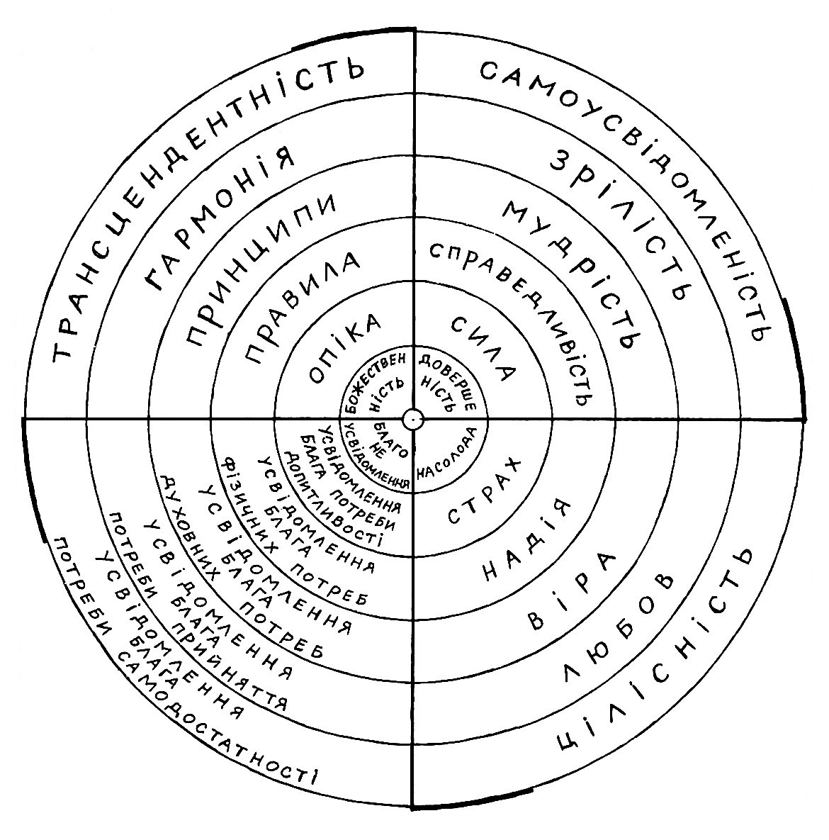 Верх: Дійсний, реальний стан речей – як людство долаючи етапи свого розвитку, йде до зрілості.