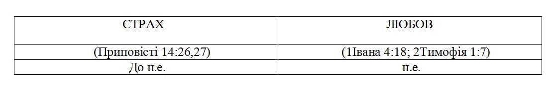 Порівняйте опис цієї драми з тим, що говорить про любов апостол Іван: «І почули вони голос Господа Бога, що по раю ходив, як повіяв денний холодок. І сховався Адам і його жінка від Господа Бога серед дерев раю. І закликав Господь Бог до Адама, і до нього сказав: Де ти? А той відповів: Почув я Твій голос у раю і злякався, бо нагий я, і сховався. І промовив Господь: Хто сказав тобі, що ти нагий? Чи ти не їв з того дерева, що Я звелів був тобі, щоб ти з нього не їв? Адам відказав: Жінка, що дав Ти її, щоб зо мною була, вона подала мені з того дерева, і я їв. І до змія сказав Господь Бог: За те, що зробив ти оце, то ти проклятіший над усю худобу, і над усю звірину польову! На своїм череві будеш плазувати, і порох ти їстимеш у всі дні свойого життя. Тоді Господь Бог промовив до жінки: Що це ти наробила? А жінка сказала: Змій спокусив мене, і я їла» (Буття 3:8-14). «Страху немає в любові, але досконала любов проганяє страх геть, бо страх має муку. Хто ж боїться, той не досконалий в любові» (1 Івана 4:18).