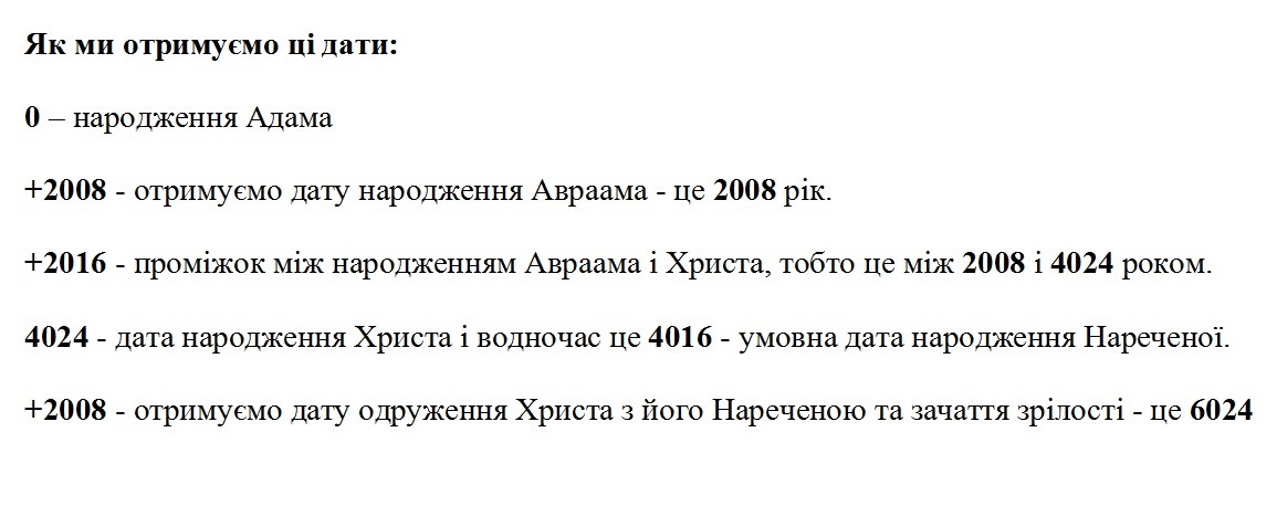Слід зазначити, що подані дати є схематичними та символічними, тому не слід їх усіх сприймати надто буквально, особливо це стосується народження символічної Невісти, яке відбулось тільки через 33 роки після вказаної дати у день п’ятидесятниці, під час злиття Святого Духу на учнів Христа.