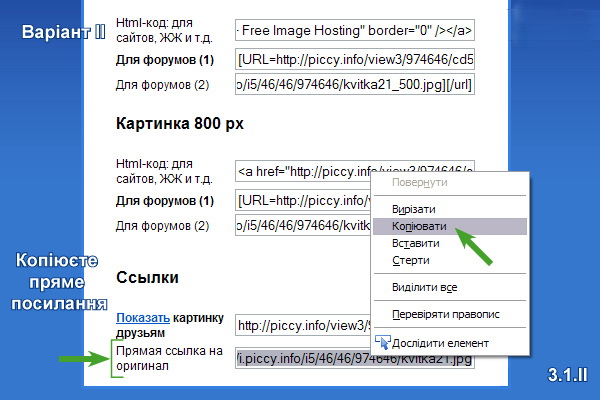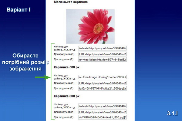 Після завантаження обираєте потрібний Вам розмір зображення (Маленькая картинка, Картинка 500 px, Картинка 800 px) (3.1.I) і копіюєте посилання «Html-код: для сайтов, ЖЖ и т.д.» (3.2.I), який буде мати приблизно такий страшний вигляд: