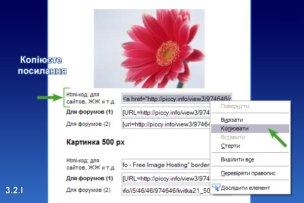 Або знизу копіюєте посилання «Прямая ссылка на оригинал» (3.1.ІІ), яка буде мати приблизно такий вигляд: http:// i.piccy.info/i5/46/46/974646/kvitka21.jpg