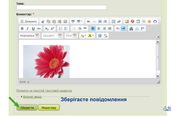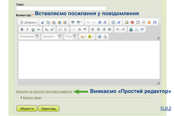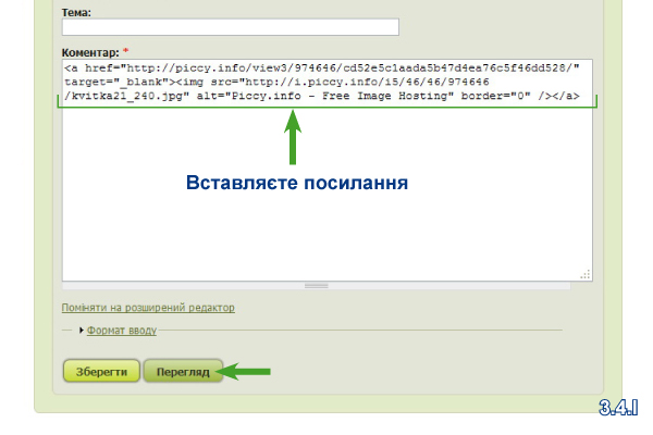 Далі вставляєте скопійоване посилання зображення в потрібне місце Вашого повідомлення (3.4.I), попередньо натиснувши на «Простий редактор» (3.3.I). Якщо цього не зробити, Ваше посилання буде сприйматися як звичайний текст.