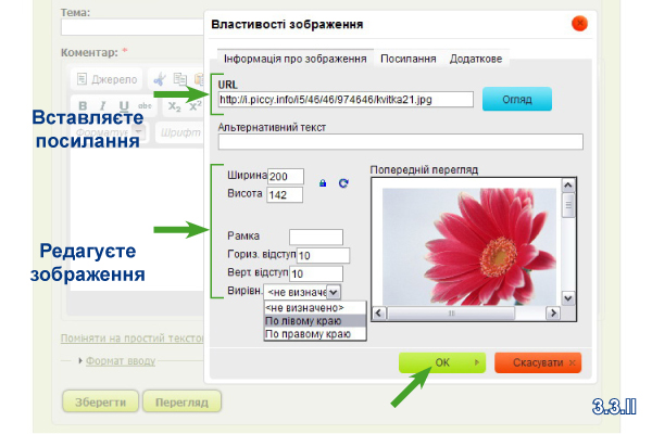 «Вставити/Редагувати зображення» (3.2.ІІ) і вставляєте скопійоване посилання зображення в поле «URL» закладки «Інформація про зображення» (3.3.ІІ). На цій закладці Ви маєте змогу редагувати Ваше зображення (розмір, горизонтальний і вертикальний відступ, вирівнювання).