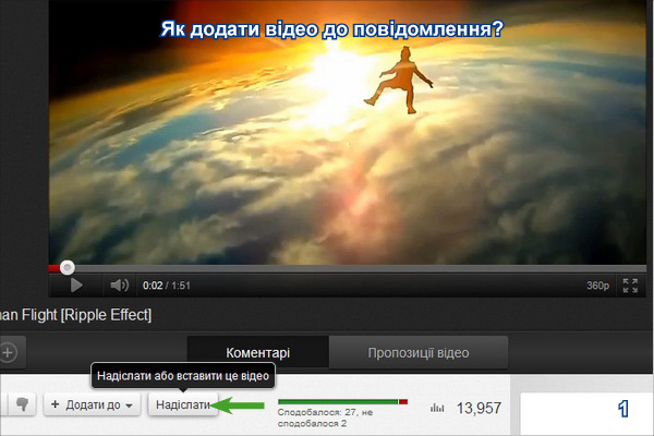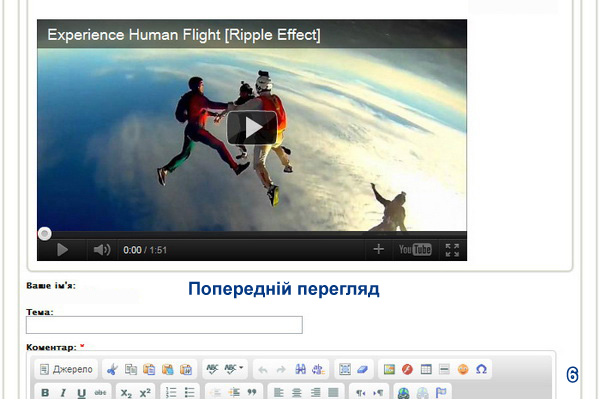 Ви можете додавати у повідомлення своє відео або знайдене Вами у інтернеті. Щоб додати своє відео, Вам спочатку необхідно залити свої відео-файли на інший ресурс – наприклад такий як: ]]>http://www.youtube.com]]>