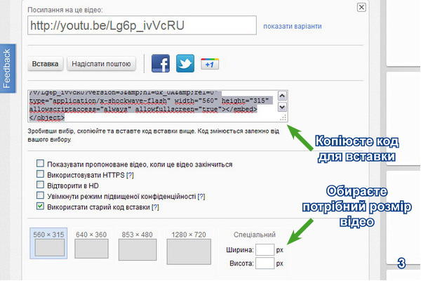 2. В розділі «Вставка» обираєте потрібний Вам розмір відеоплеєра і копіюєте код для вставки (3);