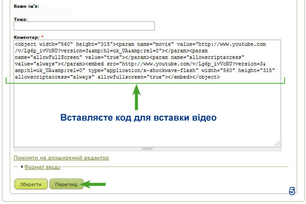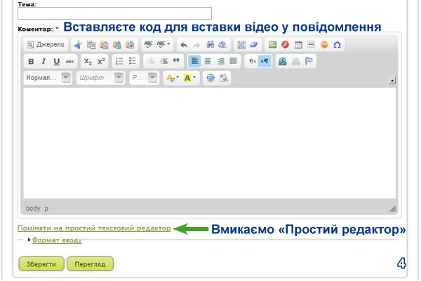 3. Вставляєте скопійований код для вставки відео в потрібне місце Вашого повідомлення (5), попередньо натиснувши на «Простий редактор» (4). Якщо цього не зробити, Ваш код для вставки відео буде сприйматися як звичайний текст.