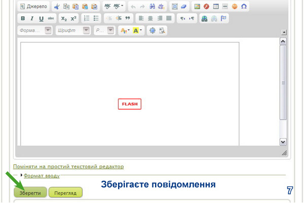 4. Внизу сторінки натискаєте «Попередній перегляд» (5), якщо хочете продивитись, який вигляд матиме Ваше повідомлення (6). Якщо Вас все задовольняє, натискаєте «Зберегти» (7).